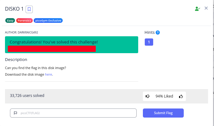 Diberikan sebuah lab bernama DISKO_1, berdasarkan hasil observasi awal cara untuk menyelesaikan lab ini adalah dengan cara mencari flag pada file disk yang sudah diberikan pada tantangan ini.