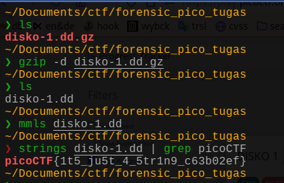 Setelah proses ekstrak berhasil saya mencoba menggunakan tools mmls, tapi sayangnya tidak menghasilkan apapun. Karena format flag pada platform picoCTF adalah picoCTF{flag}, maka saya mencoba menggunakan command strings dan grep dan ternyata saya langsung mendapatkan flag-nya.