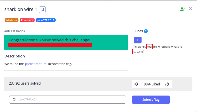 Diberikan sebuah lab bernama shark_on_wire_1, berdasarkan hasil observasi awal cara untuk menyelesaikan lab ini adalah dengan cara menganalisis trafic pada file yang diberikan pada tantangan ini, selain itu pada hints diberikan petunjuk untuk menggunakan tools streams di wireshark.