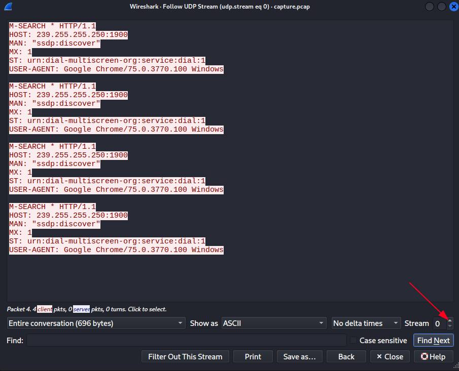 Setelah masuk ke tampilan udp stream saya mencoba menganalisis bagian 0 dan untuk lanjut ke bagian selanjutnya ikuti tanda panah pada gambar.