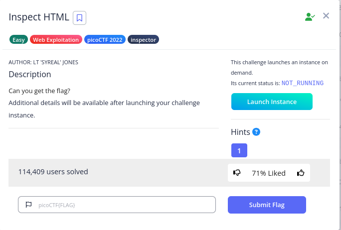 Diberikan sebuah lab bernama Inspect HTML picoCTF, berdasarkan hasil observasi awal cara untuk menyelesaikan lab ini adalah dengan cara melihat source code pada website target yang sudah disediakan.
