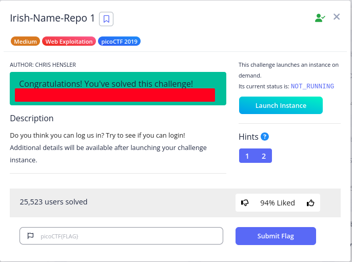 Diberikan sebuah lab bernama Irish_Name_Repo_1. Cara untuk menyelesaikan lab ini adalah dengan berhasil login dan masuk ke dalam dashboard untuk mendapatkan flagnya. Tapi kemungkinan tidak semudah itu karena soal ini berada pada level medium.