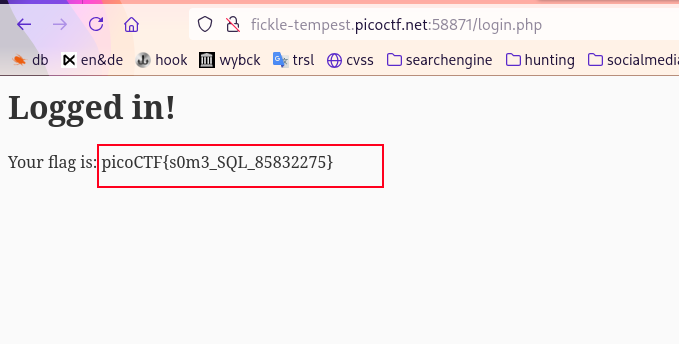 Benar saja saat saya login menggunakan payload tersebut, saya langsung mendapatkan flag-nya.